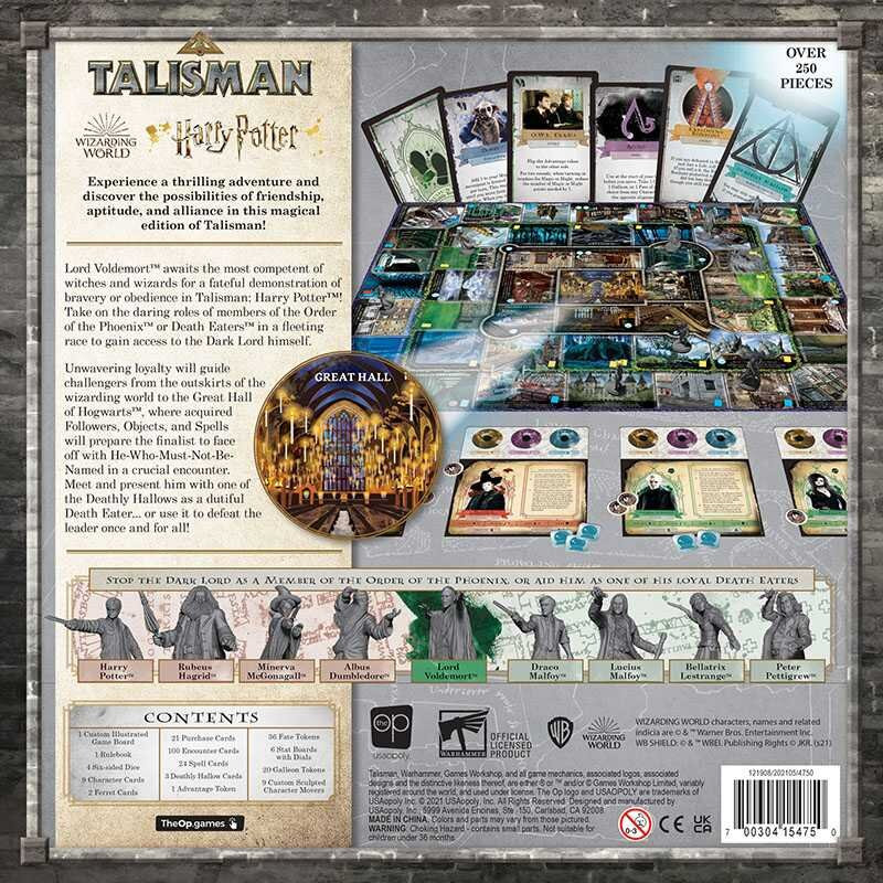 Lord Voldemort™ awaits the most competent of witches and wizards for a fateful demonstration of bravery or obedience in Talisman: Harry Potter™! Take on the daring roles of members of the Order of the Phoenix™ or Death Eaters™ in a fleeting race around Hogwarts™ to gain access to the Dark Lord himself. Equip yourself with Objects and gain Followers such as Ginny Weasley™ or Narcissa Malfoy for skills and protection along the way. Reach the end to present one of the Deathly Hallows as a dutiful Death Eater… or use it to defeat the leader once and for all!