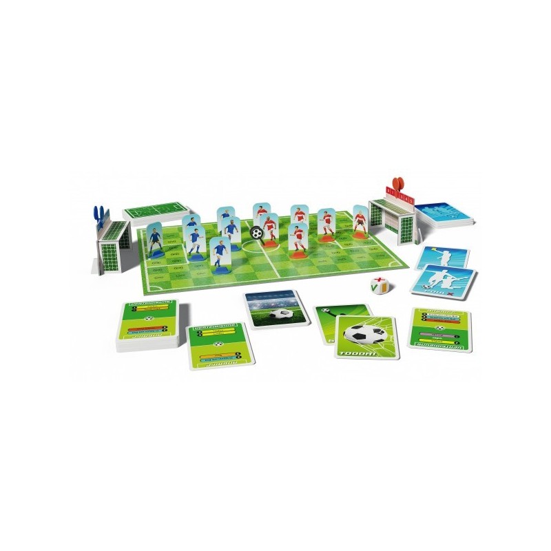 Die Fußballspieler nehmen ihre Positionen auf dem Spielfeld ein. Die Spieler müssen ihre Mannschaft durch geschicktes Freilaufen, Dribbeln und Passen in den Torraum bringen. Wer an der Reihe ist, spielt eine Taktik-Karte aus und bewegt die Spieler und den Ball. Wenn es ein Spieler durch cleveren Einsatz seiner Taktik-Karten bis vors Tor geschafft hat, entscheiden die Torschuss-Karten, ob er ins Tor trifft oder der Torwart hält. In der Profi-Variante sorgen Zweikampf-Karten mit Foul oder Gelber Karte für noch mehr Spannung und Fußball-Feeling. Für 2 4 Spieler ab 8 Jahren.| Sprache | Deutsch |