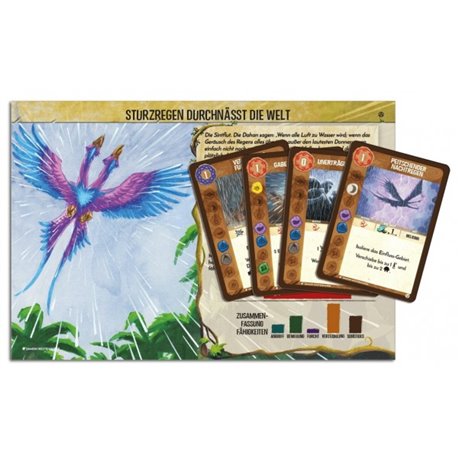 <p><span style="color:#3a4649;font-family:OfficinaSansBook, sans-serif;font-size:20px;font-style:normal;font-weight:500;letter-spacing:normal;text-indent:0px;text-transform:none;white-space:normal;word-spacing:0px;background-color:#ffffff;float:none;">Die Dahan sagen: „Wenn alle Luft zu Wasser wird; wenn das Geräusch des Regens alles übertönt, außer den lautesten Donner; wenn einfach nicht noch mehr Wasser auf einmal fallen kann – und dann plötzlich doppelt so viel herabstürzt: Das ist der Sturzregen.“ Der Geist<span> </span></span><b style="font-weight:bold;color:#3a4649;font-family:OfficinaSansBook, sans-serif;font-size:20px;font-style:normal;letter-spacing:normal;text-indent:0px;text-transform:none;white-space:normal;word-spacing:0px;background-color:#ffffff;">Sturzregen durchnässt die Welt</b><span style="color:#3a4649;font-family:OfficinaSansBook, sans-serif;font-size:20px;font-style:normal;font-weight:500;letter-spacing:normal;text-indent:0px;text-transform:none;white-space:normal;word-spacing:0px;background-color:#ffffff;float:none;"><span> </span>verbindet mit seinen Wassern die hohen Himmel mit der tiefsten Erde. Er repräsentiert sowohl eine Steigerung des Wachstums und des Lebens als auch die Überschwemmung und das Fortreißen von schlichtweg allem bis auf die stark verwurzelten Pflanzen. Obwohl manchmal spielerisch und freundlich, ist er vor allem ein Geist des ungebremsten Exzesses.</span></p>| Sprache | Deutsch |