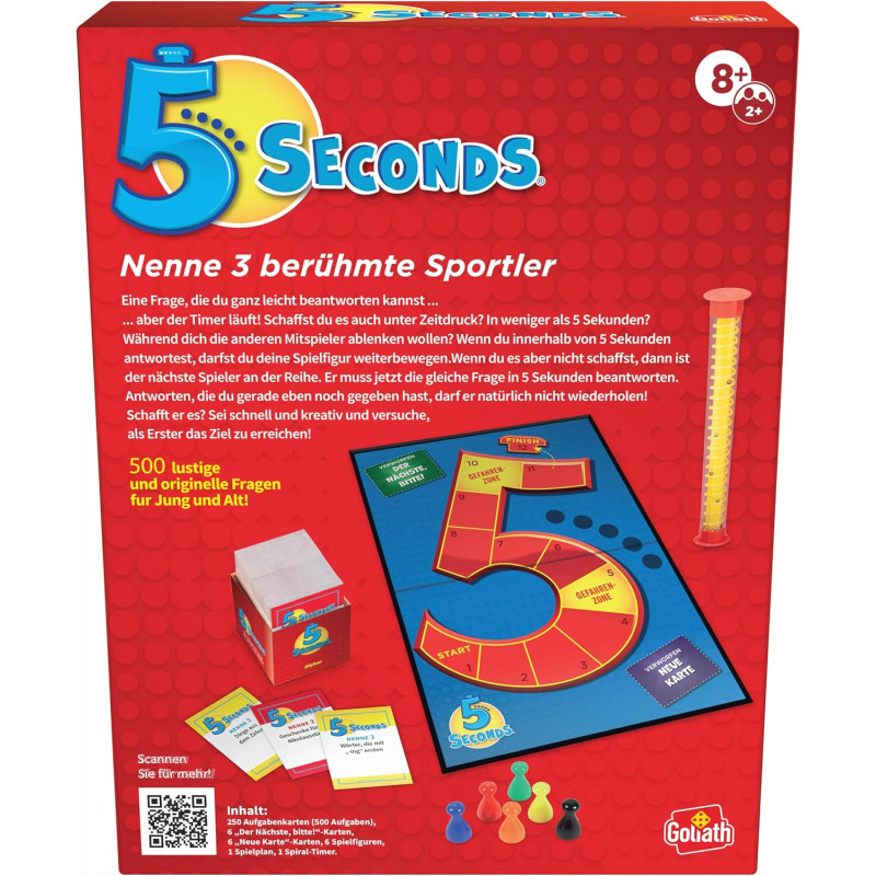 <ul class="a-unordered-list a-vertical a-spacing-mini" style="margin:0px 0px 0px 18px;color:#0f1111;padding:0px;font-family:'Amazon Ember', Arial, sans-serif;font-size:14px;font-style:normal;font-weight:400;letter-spacing:normal;text-indent:0px;text-transform:none;word-spacing:0px;white-space:normal;background-color:#ffffff;"> <li class="a-spacing-mini" style="list-style:disc;margin:0px;"><span class="a-list-item" style="color:#0f1111;">EIN BRETTSPIEL FÜR DIE GANZE FAMILIE: 5 Seconds ist ein lustiges, rasantes Brettspiel für Kinder ab 8 Jahren. Ob jung oder alt: Alle stellen sich blitzschnellen Herausforderungen, bei denen Spontanität und Kreativität gefragt sind. Perfekt für einen Spieleabend voller Lacher, überraschender Wendungen und jede Menge Spaß.</span></li> <li class="a-spacing-mini" style="list-style:disc;margin:0px;"><span class="a-list-item" style="color:#0f1111;">ANTWORTEN IN 5 SEKUNDEN: Können Sie eine Frage beantworten, indem Sie 3 Antworten innerhalb von 5 Sekunden geben? Dieses Brettspiel wird Ihre Nerven auf die Probe stellen. Unter Zeitdruck sind Schnelligkeit, Kreativität und ein guter Überblick gefragt – ein Spiel, das Konzentration und Spontaneität gleichermaßen fördert.</span></li> <li class="a-spacing-mini" style="list-style:disc;margin:0px;"><span class="a-list-item" style="color:#0f1111;">500 FRAGEN, DAMIT ES NIE LANGWEILIG WIRD: Mit 500 Fragen, verteilt auf 250 Karten, wird dieses stimmungsvolle Brettspiel nie langweilig. Jedes Spiel ist einzigartig, unvorhersehbar und witzig, perfekt für Ihre Spieleabende.</span></li> <li class="a-spacing-mini" style="list-style:disc;margin:0px;"><span class="a-list-item" style="color:#0f1111;">EINFACHE REGELN, SCHNELLES SPIEL: Jeder Spieler hat 5 Sekunden Zeit, um 3 Antworten auf eine Frage zu geben, sonst verpasst er seinen Zug. Der nächste Spieler darf die vorherigen Antworten nicht wiederholen! Dieses Brettspiel erzeugt eine lustige Spannung, die in jeder Runde zu Überraschungen führt.</span></li> <li class="a-spacing-mini" style="list-style:disc;margin:0px;"><span class="a-list-item" style="color:#0f1111;">GESCHENKIDEE AB 8 JAHREN: Ob zu Geburtstagen, an Feiertagen oder für gemeinsame Spieleabende, 5 Seconds eignet sich hervorragend als Geschenk für Kinder ab 8 Jahren sowie für die ganze Familie. Dazu ist dieses kompakte Brettspiel leicht mitzunehmen und schnell spielbereit.</span></li> </ul>