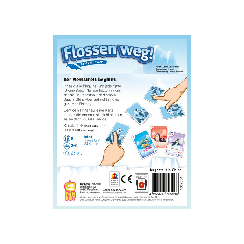 <p><span style="color:#000000;font-family:Verdana, Arial, sans;font-size:13.3333px;font-style:normal;font-weight:400;letter-spacing:normal;text-indent:0px;text-transform:none;word-spacing:0px;white-space:normal;background-color:#ffffff;float:none;">Ein Spiel für Fingerakrobaten und Schauspieler!<span> </span></span><strong style="color:#000000;font-family:Verdana, Arial, sans;font-size:13.3333px;font-style:normal;letter-spacing:normal;text-indent:0px;text-transform:none;word-spacing:0px;white-space:normal;background-color:#ffffff;">Flossen weg!</strong><span style="color:#000000;font-family:Verdana, Arial, sans;font-size:13.3333px;font-style:normal;font-weight:400;letter-spacing:normal;text-indent:0px;text-transform:none;word-spacing:0px;white-space:normal;background-color:#ffffff;float:none;"><span> </span>ist ein Partyspiel, bei dem der wahre Spaß im Chaos und Taktieren liegt!</span><br style="color:#000000;font-family:Verdana, Arial, sans;font-size:13.3333px;font-style:normal;font-weight:400;letter-spacing:normal;text-indent:0px;text-transform:none;word-spacing:0px;white-space:normal;background-color:#ffffff;" /><br style="color:#000000;font-family:Verdana, Arial, sans;font-size:13.3333px;font-style:normal;font-weight:400;letter-spacing:normal;text-indent:0px;text-transform:none;word-spacing:0px;white-space:normal;background-color:#ffffff;" /><span style="color:#000000;font-family:Verdana, Arial, sans;font-size:13.3333px;font-style:normal;font-weight:400;letter-spacing:normal;text-indent:0px;text-transform:none;word-spacing:0px;white-space:normal;background-color:#ffffff;float:none;">Die Regeln sind ganz einfach:</span><br style="color:#000000;font-family:Verdana, Arial, sans;font-size:13.3333px;font-style:normal;font-weight:400;letter-spacing:normal;text-indent:0px;text-transform:none;word-spacing:0px;white-space:normal;background-color:#ffffff;" /><span style="color:#000000;font-family:Verdana, Arial, sans;font-size:13.3333px;font-style:normal;font-weight:400;letter-spacing:normal;text-indent:0px;text-transform:none;word-spacing:0px;white-space:normal;background-color:#ffffff;float:none;">Sei der Letzte, der mit dem Finger eine Karte berührt – dann gehört sie dir! Aber Achtung: Ihr dürft nur eure Finger benutzen, um Karten zu berühren oder loszulassen. Das bedeutet auch, dass ihr manchmal eine Karte loslassen müsst, um eine neue zu erreichen. Doch wie erkennt man, ob es ein dicker Fisch ist – oder eine Falle?</span><br style="color:#000000;font-family:Verdana, Arial, sans;font-size:13.3333px;font-style:normal;font-weight:400;letter-spacing:normal;text-indent:0px;text-transform:none;word-spacing:0px;white-space:normal;background-color:#ffffff;" /><br style="color:#000000;font-family:Verdana, Arial, sans;font-size:13.3333px;font-style:normal;font-weight:400;letter-spacing:normal;text-indent:0px;text-transform:none;word-spacing:0px;white-space:normal;background-color:#ffffff;" /><span style="color:#000000;font-family:Verdana, Arial, sans;font-size:13.3333px;font-style:normal;font-weight:400;letter-spacing:normal;text-indent:0px;text-transform:none;word-spacing:0px;white-space:normal;background-color:#ffffff;float:none;">Ihr seid reihum an der Reihe, zieht eine Karte, schaut sie euch heimlich an, legt sie irgendwo auf den Tisch und legt einen Finger darauf. Dann ladet ihr die anderen ein, das Gleiche zu tun. Nach und nach kommen mehr Karten auf den Tisch – und ihr dürft euren Finger von einer Karte zur nächsten bewegen.</span><br style="color:#000000;font-family:Verdana, Arial, sans;font-size:13.3333px;font-style:normal;font-weight:400;letter-spacing:normal;text-indent:0px;text-transform:none;word-spacing:0px;white-space:normal;background-color:#ffffff;" /><span style="color:#000000;font-family:Verdana, Arial, sans;font-size:13.3333px;font-style:normal;font-weight:400;letter-spacing:normal;text-indent:0px;text-transform:none;word-spacing:0px;white-space:normal;background-color:#ffffff;float:none;">Sobald nur noch eine Person ihren Finger auf einer Karte hat, bekommt sie die Karte – und entdeckt, was sich darunter verbirgt. Wer am Ende die meisten Punkte hat, gewinnt!</span><br style="color:#000000;font-family:Verdana, Arial, sans;font-size:13.3333px;font-style:normal;font-weight:400;letter-spacing:normal;text-indent:0px;text-transform:none;word-spacing:0px;white-space:normal;background-color:#ffffff;" /><br style="color:#000000;font-family:Verdana, Arial, sans;font-size:13.3333px;font-style:normal;font-weight:400;letter-spacing:normal;text-indent:0px;text-transform:none;word-spacing:0px;white-space:normal;background-color:#ffffff;" /><span style="color:#000000;font-family:Verdana, Arial, sans;font-size:13.3333px;font-style:normal;font-weight:400;letter-spacing:normal;text-indent:0px;text-transform:none;word-spacing:0px;white-space:normal;background-color:#ffffff;float:none;">Aber aufgepasst: Nicht jede Karte bringt Punkte. Manche Karten zeigen nämlich keine leckeren Fische, sondern gefährliche Pinguin-Räuber – die kosten Punkte!</span><br style="color:#000000;font-family:Verdana, Arial, sans;font-size:13.3333px;font-style:normal;font-weight:400;letter-spacing:normal;text-indent:0px;text-transform:none;word-spacing:0px;white-space:normal;background-color:#ffffff;" /><br style="color:#000000;font-family:Verdana, Arial, sans;font-size:13.3333px;font-style:normal;font-weight:400;letter-spacing:normal;text-indent:0px;text-transform:none;word-spacing:0px;white-space:normal;background-color:#ffffff;" /><span style="color:#000000;font-family:Verdana, Arial, sans;font-size:13.3333px;font-style:normal;font-weight:400;letter-spacing:normal;text-indent:0px;text-transform:none;word-spacing:0px;white-space:normal;background-color:#ffffff;float:none;">Dazu gibt es noch Aktionskarten: Eine lässt euch eine Karte abwerfen, eine andere zwingt euch oder einen Mitspieler, den Finger von einer Karte zu nehmen. Besonders spannend: Eine Ereigniskarte bringt euch +6 Punkte, aber wenn ihr 