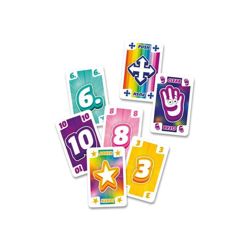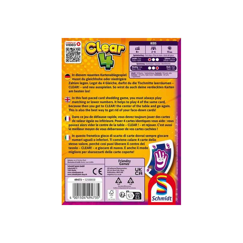 In diesem rasanten Kartenablegespiel musst du gleichhohe oder niedrigere Zahlen legen. Legst du 4 Gleiche, darfst du die Tischmitte leeräumen – CLEAR! – und neu ausspielen. So wirst du auch deine verdeckten Karten bestens los!