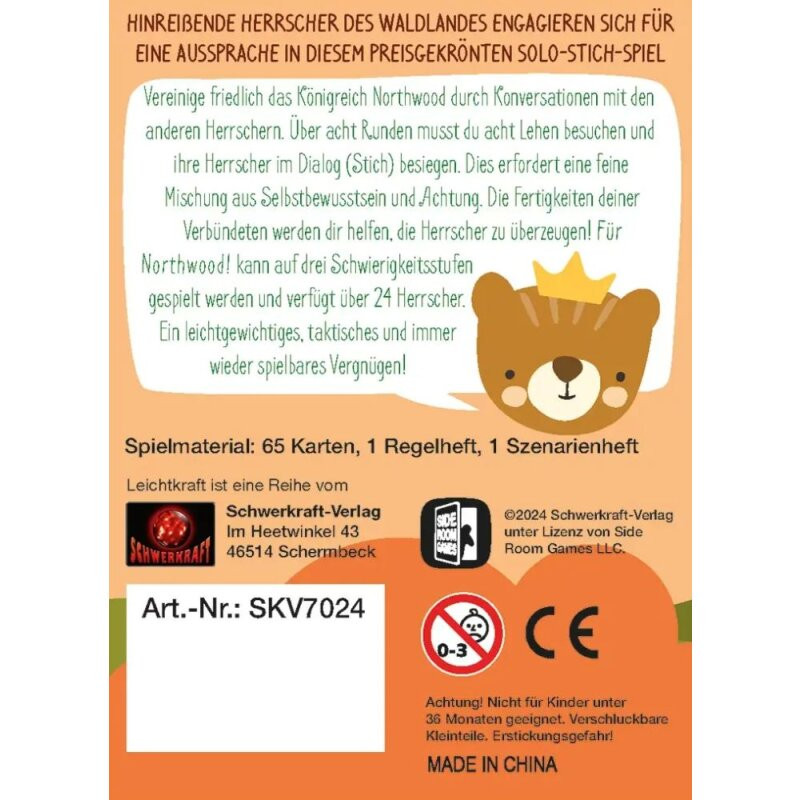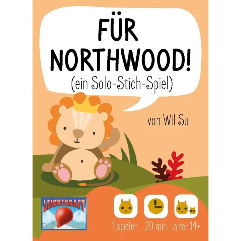 <div align="center" style="color:#000000;font-family:Roboto, sans-serif;font-style:normal;font-weight:400;letter-spacing:normal;text-indent:0px;text-transform:none;word-spacing:0px;white-space:normal;background-color:#ffffff;margin:0cm;font-size:10pt;">Vollständig deutsche Ausgabe von "For Northwood! A Solo Trick-Taking Game"</div> <p style="margin-top:0px;color:#000000;font-family:Roboto, sans-serif;font-size:14.0625px;font-style:normal;font-weight:400;letter-spacing:normal;text-align:left;text-indent:0px;text-transform:none;word-spacing:0px;white-space:normal;background-color:#ffffff;"><br />Vereinige friedlich das Königreich<span> </span><em>Northwood<span> </span></em>durch Konversationen mit den anderen Herrschern. Über acht Runden musst du acht Lehen besuchen und ihre Herrscher im Dialog (Stich) besiegen. Dies erfordert eine feine Mischung aus Selbstbewusstsein und Achtung. Die Fertigkeiten deiner Verbündeten werden dir helfen, die Herrscher zu überzeugen!<span> </span><strong style="font-weight:bolder;">Für Northwood!</strong><span> </span>kann auf drei Schwierigkeitsstufen gespielt werden und verfügt über 24 Herrscher. Ein leichtgewichtiges, taktisches und immer wieder spielbares Vergnügen!</p> <p style="margin-top:0px;color:#000000;font-family:Roboto, sans-serif;font-size:14.0625px;font-style:normal;font-weight:400;letter-spacing:normal;text-align:left;text-indent:0px;text-transform:none;word-spacing:0px;white-space:normal;background-color:#ffffff;"><strong style="font-weight:bolder;">Für Northwood!</strong><span> </span>ist ein Solo-Stich-Spiel und kann daher nur alleine gespielt werden.</p> <p style="margin-top:0px;color:#000000;font-family:Roboto, sans-serif;font-size:14.0625px;font-style:normal;font-weight:400;letter-spacing:normal;text-align:left;text-indent:0px;text-transform:none;word-spacing:0px;white-space:normal;background-color:#ffffff;">Spielinhalt:</p> <ul style="margin-top:0px;color:#000000;font-family:Roboto, sans-serif;font-size:14.0625px;font-style:normal;font-weight:400;letter-spacing:normal;text-align:left;text-indent:0px;text-transform:none;word-spacing:0px;white-space:normal;background-color:#ffffff;"> <li>65 Karten</li> <li>1 Regelheft</li> <li>1 Szenarienheft</li> </ul>
