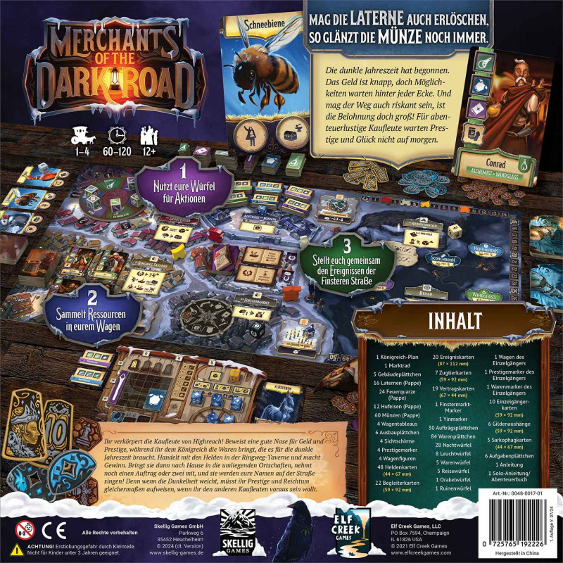 Nach einem halben Jahr mit Tageslicht beginnt die dunkle Jahreszeit. In „Merchants of the Dark Road“ schlüpfen 1 bis 4 Spieler ab 12 Jahren in die Rolle mutiger Händler, die sich auf gefährliche Reisen begeben, um die Stadt Highreach mit Waren und Helden zu versorgen. Das Spiel kombiniert strategische Planung mit einem Rondell-Aktionssystem, bei dem jede Entscheidung zählt. Die Spieler müssen ihre Kutschen beladen, Marktpreise manipulieren und sich den Herausforderungen der dunklen Straßen stellen. Dabei gilt es, Ruhm und Reichtum in Einklang zu bringen, denn am Ende zählt nur der niedrigere der beiden Werte für den Sieg.