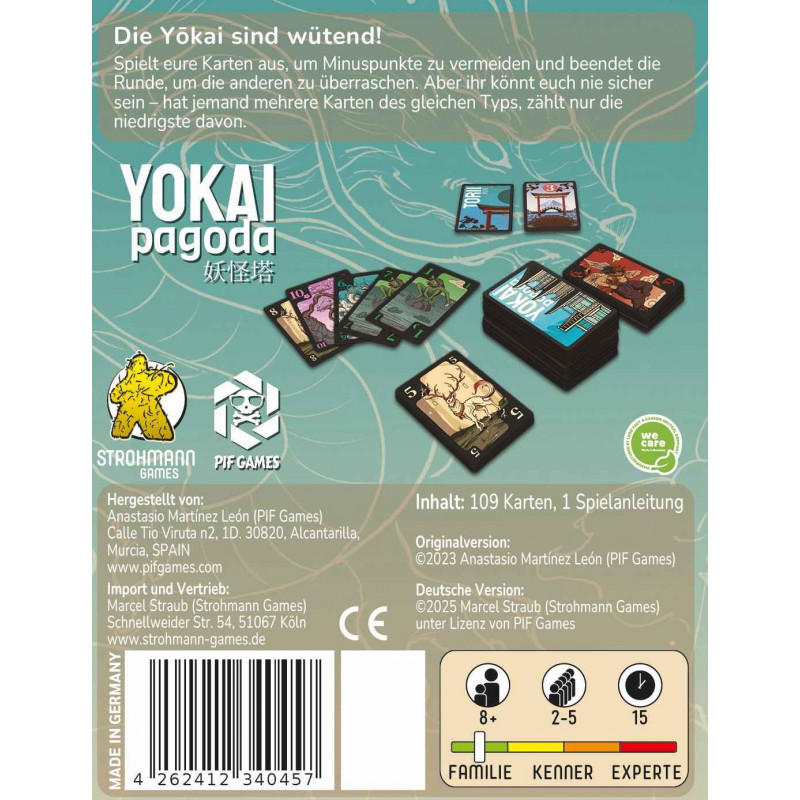 <p><span style="color:#333333;font-family:OfficinaSansITCStd, sans-serif;font-size:18px;font-style:normal;font-weight:400;letter-spacing:normal;text-indent:0px;text-transform:none;word-spacing:0px;white-space:normal;background-color:#ffffff;float:none;">Vor der untergehenden Sonne macht ihr die Silhouette einer Pagode in einiger Entfernung aus. Wie gebannt von der mysteriösen Aura des Gebäudes entscheidet ihr, das Innere zu erkunden. Doch plötzlich hört ihr ein Lachen, bemerkt einen seltsamen Schatten und Augen, die euch bösartig beobachten. Ihr habt aus Versehen die zehn mächtigen Yokai geweckt, die hier leben! Werdet ihr einen Weg finden, sie zu besänftigen und ihren Zorn abzuwenden?</span><br style="color:#333333;font-family:OfficinaSansITCStd, sans-serif;font-size:18px;font-style:normal;font-weight:400;letter-spacing:normal;text-indent:0px;text-transform:none;word-spacing:0px;white-space:normal;background-color:#ffffff;" /><br style="color:#333333;font-family:OfficinaSansITCStd, sans-serif;font-size:18px;font-style:normal;font-weight:400;letter-spacing:normal;text-indent:0px;text-transform:none;word-spacing:0px;white-space:normal;background-color:#ffffff;" /><br style="color:#333333;font-family:OfficinaSansITCStd, sans-serif;font-size:18px;font-style:normal;font-weight:400;letter-spacing:normal;text-indent:0px;text-transform:none;word-spacing:0px;white-space:normal;background-color:#ffffff;" /><br style="color:#333333;font-family:OfficinaSansITCStd, sans-serif;font-size:18px;font-style:normal;font-weight:400;letter-spacing:normal;text-indent:0px;text-transform:none;word-spacing:0px;white-space:normal;background-color:#ffffff;" /><span style="color:#333333;font-family:OfficinaSansITCStd, sans-serif;font-size:18px;font-style:normal;font-weight:400;letter-spacing:normal;text-indent:0px;text-transform:none;word-spacing:0px;white-space:normal;background-color:#ffffff;float:none;">Das Kartenspiel Yokai Pagoda spielt ihr über 3 Runden. In jeder Runde hinterlasst ihr Opfergaben in Form von Karten auf einem von zwei Ablagestapeln, um die Yokai günstig zu stimmen. Dabei versucht ihr eure Handkarten so schnell wie möglich abzubauen oder nur bestimmte Yokai zu sammeln - denn es werden am Ende des Spiels nur die niedrigsten Karten einer Yokai-Art gewertet!</span><br style="color:#333333;font-family:OfficinaSansITCStd, sans-serif;font-size:18px;font-style:normal;font-weight:400;letter-spacing:normal;text-indent:0px;text-transform:none;word-spacing:0px;white-space:normal;background-color:#ffffff;" /><br style="color:#333333;font-family:OfficinaSansITCStd, sans-serif;font-size:18px;font-style:normal;font-weight:400;letter-spacing:normal;text-indent:0px;text-transform:none;word-spacing:0px;white-space:normal;background-color:#ffffff;" /><br style="color:#333333;font-family:OfficinaSansITCStd, sans-serif;font-size:18px;font-style:normal;font-weight:400;letter-spacing:normal;text-indent:0px;text-transform:none;word-spacing:0px;white-space:normal;background-color:#ffffff;" /><br style="color:#333333;font-family:OfficinaSansITCStd, sans-serif;font-size:18px;font-style:normal;font-weight:400;letter-spacing:normal;text-indent:0px;text-transform:none;word-spacing:0px;white-space:normal;background-color:#ffffff;" /><span style="color:#333333;font-family:OfficinaSansITCStd, sans-serif;font-size:18px;font-style:normal;font-weight:400;letter-spacing:normal;text-indent:0px;text-transform:none;word-spacing:0px;white-space:normal;background-color:#ffffff;float:none;">Was macht das Spiel besonders? Warum erscheint es bei Strohmann Games?</span><br style="color:#333333;font-family:OfficinaSansITCStd, sans-serif;font-size:18px;font-style:normal;font-weight:400;letter-spacing:normal;text-indent:0px;text-transform:none;word-spacing:0px;white-space:normal;background-color:#ffffff;" /><br style="color:#333333;font-family:OfficinaSansITCStd, sans-serif;font-size:18px;font-style:normal;font-weight:400;letter-spacing:normal;text-indent:0px;text-transform:none;word-spacing:0px;white-space:normal;background-color:#ffffff;" /><br style="color:#333333;font-family:OfficinaSansITCStd, sans-serif;font-size:18px;font-style:normal;font-weight:400;letter-spacing:normal;text-indent:0px;text-transform:none;word-spacing:0px;white-space:normal;background-color:#ffffff;" /><span style="color:#333333;font-family:OfficinaSansITCStd, sans-serif;font-size:18px;font-style:normal;font-weight:400;letter-spacing:normal;text-indent:0px;text-transform:none;word-spacing:0px;white-space:normal;background-color:#ffffff;float:none;">Karten abwerfen mal ganz anders. Auch wenn ihr eure Karten bestenfalls loswerden wollt, ist es bei Yokai Pagoda manchmal gar nicht verkehrt, bestimmte Karten zu sammeln - denn es werden am Ende nur die niedrigsten Karten einer Yokai-Art gewertet. Diese spannende Wertung und die vielen interessanten Entscheidungen, die man während des Spiels treffen kann und muss, machen Yokai Pagoda für uns zu einem besonderen Kartenspiel.</span></p> <p><span style="color:#333333;font-family:OfficinaSansITCStd, sans-serif;font-size:18px;font-style:normal;font-weight:400;letter-spacing:normal;text-indent:0px;text-transform:none;word-spacing:0px;white-space:normal;background-color:#ffffff;float:none;"></span></p> <p><span style="color:#333333;font-family:OfficinaSansITCStd, sans-serif;font-size:18px;font-style:normal;font-weight:400;letter-spacing:normal;text-indent:0px;text-transform:none;word-spacing:0px;white-space:normal;background-color:#ffffff;float:none;"></span></p> <table class="pegasus-details-table pegasus-details-table-main" style="caption-side:bottom;border-collapse:collapse;color:#333333;font-family:OfficinaSansITCStd, sans-serif;font-size:18px;font-style:normal;font-weight:400;letter-spacing:normal;text-transform:none;word-spacing:0px;white-space:normal;background-color:#ffffff;"> <tbody style="border:0px solid;"> <tr style="border:0px solid;"> <td style="border:0px solid;">Personenzahl:</td> <td style="border:0px s