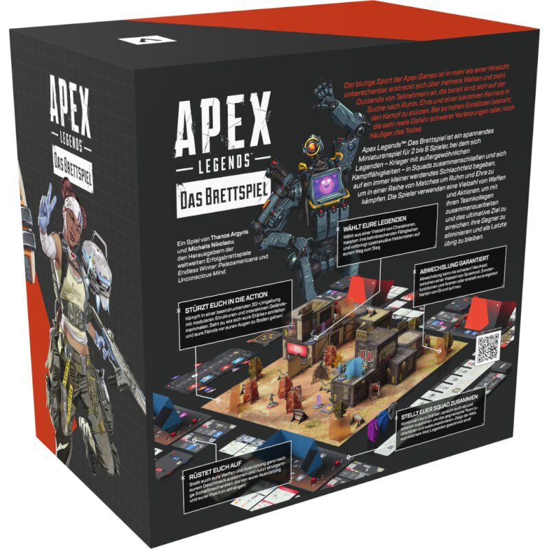 <p style="margin-top:0px;color:#000000;font-family:Lato, sans-serif;font-size:13px;font-style:normal;font-weight:400;letter-spacing:normal;text-align:left;text-indent:0px;text-transform:none;word-spacing:0px;white-space:normal;background-color:#ffffff;"><b style="font-weight:600;">WILLKOMMEN BEI DEN APEX-SPIELEN!</b><br /><em>Die Apex-Spiele wurden um das Jahr 2728 auf dem Planeten Solace ins Leben gerufen und sind ein äußerst beliebter aber blutiger Sport, der im Fernsehen u¨bertragen wird. Urspru¨nglich wurden sie auf der Insel Königsschlucht als u¨berarbeitete Fortsetzung eines alten Turniers namens „die Donnerkuppel“ ausgetragen und haben sich seitdem u¨ber mehrere Welten erstreckt. Zahlreiche Teilnehmer mit unterschiedlichen Hintergru¨nden und oft mit Hintergedanken nehmen regelmäßig an den Spielen teil. Der Lohn fu¨r ihre Mu¨hen sind Ruhm, bares Geld und manchmal eine lukrative Karriere, doch das alles hat auch seinen Preis: Es besteht die Gefahr von ernsthaften Verletzungen bis hin zum Tod.</em></p> <p style="margin-top:0px;color:#000000;font-family:Lato, sans-serif;font-size:13px;font-style:normal;font-weight:400;letter-spacing:normal;text-align:left;text-indent:0px;text-transform:none;word-spacing:0px;white-space:normal;background-color:#ffffff;"><strong style="font-weight:600;"><em>Apex Legends: Das Brettspiel</em></strong><span> </span>ist ein kompetitives, taktisches Team-gegen-Team-Miniaturenspiel für 2–6 Spieler. Jede Partie dauert etwa 60–90 Minuten, je nach Anzahl der Spieler und den ausgewählten Spielmodi. Mit einer originellen Spielmechanik und einem innovativen Regelwerk fängt das Spiel die Stimmung des Videospiels<span> </span><strong style="font-weight:600;">Apex Legends</strong><span> </span>authentisch ein und erweckt die Einsätze, den Nervenkitzel und die Kills des Battle-Royale-Erlebnisses erfolgreich zum Leben.<br /><br />Das Kernstück des Spiels, das auf dem Spielplan „Kings Canyon“ stattfindet, konzentriert sich auf die letzte Zone, in der sich die ultimative Konfrontation entfaltet. Jeder Spieler übernimmt die Rolle einer einzigartigen Legende. Die Spieler werden Team für Team aktiviert und versuchen, ihre Feinde in der Hitze des Gefechts auszumanövrieren und die unvorhersehbaren, unvergesslichen Momente aus dem Originalspiel nachzustellen, indem sie Schlüsselpositionen auf der Karte sichern, wertvolle Beute Sekunden vor einem Gegner ergattern, sich hinter Deckung begeben oder einen Teamkollegen gerade noch rechtzeitig abschirmen, um ihn vor dem Untergang zu bewahren ...<br /><br />Nach der Aktivierung kann jede Legende grundlegende Aktionen wie „Bewegen“, „Interagieren“, „Verwenden“ und „Angreifen“ ausführen. Zusätzlich können die Spieler die einzigartigen Fähigkeiten ihrer Legende (sowohl kampf- als auch nutzungsorientiert) und ein Deck mit legenden-spezifischen Aktionen nutzen, um die Oberhand zu gewinnen. Der Schlüssel zum Sieg liegt darin, ein gut zusammengestelltes Team zu bilden, in dem sich die Legenden auf dem Schlachtfeld ergänzen und alle verfügbaren strategischen Optionen nutzen.<br /><br />Nach der Aktivierung eines Teams ist das Spiel noch lange nicht vorbei! Wenn der Gegner am Zug ist, können Legenden mit Sofort- und Reaktionskarten auf feindliche Aktionen reagieren. Mit Reaktionen kann ein Spieler reagieren, wenn er oder seine Teamkollegen angegriffen werden, in Deckung gehen, ihren Schild wiederherstellen oder einem Verbündeten helfen. Wenn die Bedingungen einer Sofortkarte erfüllt sind, kann der Spieler sie aktivieren, um den nächsten Zug des Gegners auf clevere Weise zu vereiteln.<br /><br />Jede Entscheidung, jede Bewegung und jede Patrone zählt!</p>