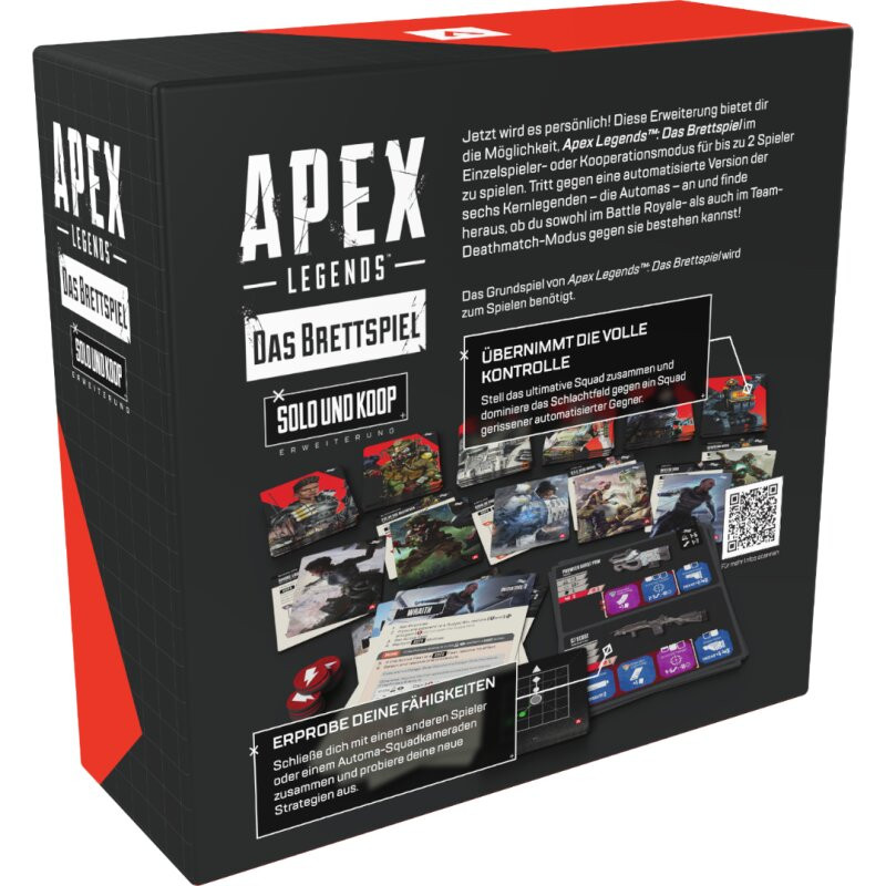 <p style="margin-top:0px;color:#000000;font-family:Lato, sans-serif;font-size:13px;font-style:normal;font-weight:400;letter-spacing:normal;text-align:left;text-indent:0px;text-transform:none;word-spacing:0px;white-space:normal;background-color:#ffffff;"><strong style="font-weight:600;"><em>Apex Legends: Das Brettspiel<span> </span></em></strong>ist ein kompetitives, taktisches Team-gegen-Team-Miniaturenspiel für 2–6 Spieler. Jede Partie dauert etwa 60–90 Minuten, je nach Anzahl der Spieler und den ausgewählten Spielmodi. Mit einer originellen Spielmechanik und einem innovativen Regelwerk fängt das Spiel die Stimmung des Videospiels<span> </span><em><strong style="font-weight:600;">Apex Legends</strong><span> </span></em>authentisch ein und erweckt die Einsätze, den Nervenkitzel und die Kills des Battle-Royale-Erlebnisses erfolgreich zum Leben.</p> <p style="margin-top:0px;color:#000000;font-family:Lato, sans-serif;font-size:13px;font-style:normal;font-weight:400;letter-spacing:normal;text-align:left;text-indent:0px;text-transform:none;word-spacing:0px;white-space:normal;background-color:#ffffff;"><strong style="font-weight:600;"><span style="font-size:24px;">Apex Legends: Das Brettspiel - Solo- und Koop-Erweiterung</span></strong></p> <p style="margin-top:0px;color:#000000;font-family:Lato, sans-serif;font-size:13px;font-style:normal;font-weight:400;letter-spacing:normal;text-align:left;text-indent:0px;text-transform:none;word-spacing:0px;white-space:normal;background-color:#ffffff;"><em>Jetzt wird es persönlich! Diese Erweiterung bietet dir die Möglichkeit,<span> </span><strong style="font-weight:600;">Apex Legends™: Das Brettspiel<span> </span></strong>im<br />Einzelspieler- oder Kooperationsmodus für bis zu 2 Spieler zu spielen. Tritt gegen eine automatisierte Version der<br />sechs Kernlegenden – die Automas – an und finde heraus, ob du sowohl im Battle Royale- als auch im Team-<br />Deathmatch-Modus gegen sie bestehen kannst!</em></p>