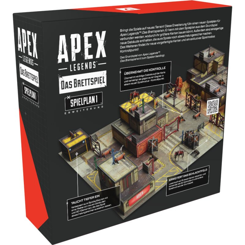 <p style="margin-top:0px;color:#000000;font-family:Lato, sans-serif;font-size:13px;font-style:normal;font-weight:400;letter-spacing:normal;text-align:left;text-indent:0px;text-transform:none;word-spacing:0px;white-space:normal;background-color:#ffffff;"><strong style="font-weight:600;"><em>Apex Legends: Das Brettspiel<span> </span></em></strong>ist ein kompetitives, taktisches Team-gegen-Team-Miniaturenspiel für 2–6 Spieler. Jede Partie dauert etwa 60–90 Minuten, je nach Anzahl der Spieler und den ausgewählten Spielmodi. Mit einer originellen Spielmechanik und einem innovativen Regelwerk fängt das Spiel die Stimmung des Videospiels<span> </span><em><strong style="font-weight:600;">Apex Legends</strong><span> </span></em>authentisch ein und erweckt die Einsätze, den Nervenkitzel und die Kills des Battle-Royale-Erlebnisses erfolgreich zum Leben.</p> <p style="margin-top:0px;color:#000000;font-family:Lato, sans-serif;font-size:13px;font-style:normal;font-weight:400;letter-spacing:normal;text-align:left;text-indent:0px;text-transform:none;word-spacing:0px;white-space:normal;background-color:#ffffff;"> </p> <p style="margin-top:0px;color:#000000;font-family:Lato, sans-serif;font-size:13px;font-style:normal;font-weight:400;letter-spacing:normal;text-align:left;text-indent:0px;text-transform:none;word-spacing:0px;white-space:normal;background-color:#ffffff;"><span style="font-size:26px;"><strong style="font-weight:600;">Apex Legends: Das Brettspiel - Spielplan 1-Erweiterung</strong></span></p> <p style="margin-top:0px;color:#000000;font-family:Lato, sans-serif;font-size:13px;font-style:normal;font-weight:400;letter-spacing:normal;text-align:left;text-indent:0px;text-transform:none;word-spacing:0px;white-space:normal;background-color:#ffffff;">Diese Erweiterung für<span> </span><em><strong style="font-weight:600;">Apex Legends: Das Brettspiel</strong></em><span> </span>führt zusätzliche Spielpläne, ein Gebäude-Set aus Pappe mit einem neuen grafischen Stil, zusätzliche Pappkomponenten und einen speziellen Mauer-Typ mit einem einzigartigen Effekt ein. Das Spielmaterial aus dieser Erweiterung könnt ihr verwenden, um größere Karten zu erstellen, indem ihr sie mit denen aus dem Grundspiel kombiniert.</p> <p style="margin-top:0px;color:#000000;font-family:Lato, sans-serif;font-size:13px;font-style:normal;font-weight:400;letter-spacing:normal;text-align:left;text-indent:0px;text-transform:none;word-spacing:0px;white-space:normal;background-color:#ffffff;"></p> <p style="margin-top:0px;color:#000000;font-family:Lato, sans-serif;font-size:13px;font-style:normal;font-weight:400;letter-spacing:normal;text-align:left;text-indent:0px;text-transform:none;word-spacing:0px;white-space:normal;background-color:#ffffff;"><br />Außerdem gibt es einen neuen Spielmodus - Kontrollpunkt sowie eine Reihe neuer, vorgefertigter Karten, die auch mit den Spielmodi des Grundspiels gespielt werden können.</p> <p style="margin-top:0px;color:#000000;font-family:Lato, sans-serif;font-size:13px;font-style:normal;font-weight:400;letter-spacing:normal;text-align:left;text-indent:0px;text-transform:none;word-spacing:0px;white-space:normal;background-color:#ffffff;"></p> <h2 class="wp-block-heading" style="margin-top:0px;font-family:Lato, sans-serif;font-weight:400;line-height:1.2;color:#484b4f;font-style:normal;letter-spacing:normal;text-align:left;text-indent:0px;text-transform:none;word-spacing:0px;white-space:normal;background-color:#ffffff;"><span style="font-size:26px;">SPIELMODUS: KONTROLLPUNKT</span></h2> <p style="margin-top:0px;color:#000000;font-family:Lato, sans-serif;font-size:13px;font-style:normal;font-weight:400;letter-spacing:normal;text-align:left;text-indent:0px;text-transform:none;word-spacing:0px;white-space:normal;background-color:#ffffff;"></p> <p style="margin-top:0px;color:#000000;font-family:Lato, sans-serif;font-size:13px;font-style:normal;font-weight:400;letter-spacing:normal;text-align:left;text-indent:0px;text-transform:none;word-spacing:0px;white-space:normal;background-color:#ffffff;">Das Ziel im Spielmodus Kontrollpunkt ist es, eine bestimmte Anzahl von Punkten zu erreichen. Diese könnt<br />ihr zwar erhalten, indem ihr einfach eure Gegner ausschaltet, aber es ist viel effizienter, eine Reihe von Kontrollpunkten<br />zu übernehmen, die speziell für diesen Spielmodus entwickelt wurden und auf dem Spielplan verteilt sind.<br />Zu Beginn des Spiels hat ein Squad den Spielplan unter seiner Kontrolle. Der andere Squad beginnt das Spiel mit<br />der Initiative.</p> <p style="margin-top:0px;color:#000000;font-family:Lato, sans-serif;font-size:13px;font-style:normal;font-weight:400;letter-spacing:normal;text-align:left;text-indent:0px;text-transform:none;word-spacing:0px;white-space:normal;background-color:#ffffff;"><em>Bringt die Spiele auf neues Terrain! Diese Erweiterung führ einen neuen Spielplan für Apex Legends™: Das Brettspiel ein. Er kann mit dem Spielplan aus dem Grundspiel verbunden werden, wodurch ihr größere Karten bauen könnt. Außerdem sind einzigartige neue Gebäude enthalten, die eure Spiele noch abwechslungsreicher machen. Des Weiteren findet ihr neue vorgefertigte Karten und ein exklusiver Spielmodus: Kontrollpunkt!</em></p>