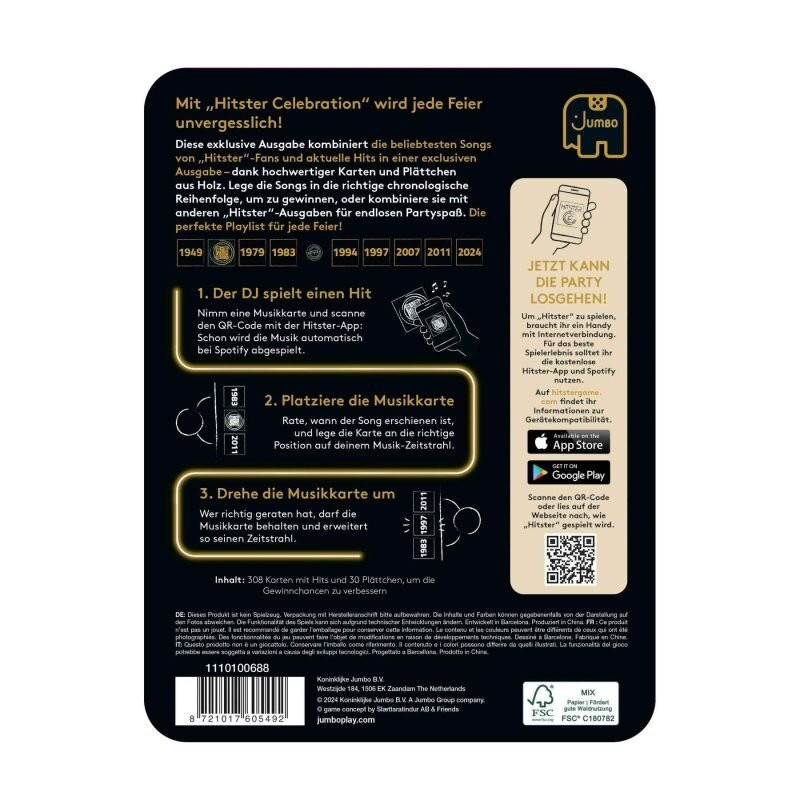 <p><span style="font-family:Inter, sans-serif;font-size:16px;font-style:normal;font-weight:400;letter-spacing:.6px;text-indent:0px;text-transform:none;word-spacing:0px;white-space:normal;background-color:#f7f7f7;float:none;">Hitster Celebration ist die ultimative Edition für festliche Anlässe und kombiniert die beliebtesten Fan-Favoriten mit den aktuellsten Hits in einer Premium-Kollektion. Mit hochwertigen Karten und Holzmarkern enthält diese exklusive Ausgabe über 300 sorgfältig ausgewählte Songs für endlosen Partyspaß. Rund 70 dieser Songs sind beliebte „Fan Picks“, die auch in anderen Hitster-Editionen vorkommen – so ist sichergestellt, dass die besten und meistgewünschten Songs in einer einzigen Feier-Playlist vereint sind. Fordere deine Freunde und Familie heraus, die Songs in die richtige chronologische Reihenfolge zu legen, oder kombiniere sie mit anderen Hitster-Editionen für noch mehr Abwechslung. Die perfekte Playlist für jede Feier!</span></p> <p></p> <p><span style="color:#121212;font-family:Assistant, sans-serif;font-size:16px;font-style:normal;font-weight:400;letter-spacing:.84px;text-align:center;text-indent:0px;text-transform:none;word-spacing:0px;white-space:normal;background-color:#f7f7f7;float:none;">2-10 Spieler</span></p> <p><span style="color:#121212;font-family:Assistant, sans-serif;font-size:16px;font-style:normal;font-weight:400;letter-spacing:.84px;text-align:center;text-indent:0px;text-transform:none;word-spacing:0px;white-space:normal;background-color:#f7f7f7;float:none;">16+ Jahre</span></p> <p>30 min</p> <p><span style="color:#121212;font-family:Assistant, sans-serif;font-size:16px;font-style:normal;font-weight:400;letter-spacing:.84px;text-align:center;text-indent:0px;text-transform:none;word-spacing:0px;white-space:normal;background-color:#f7f7f7;float:none;"><br class="Apple-interchange-newline" /><br /></span></p>