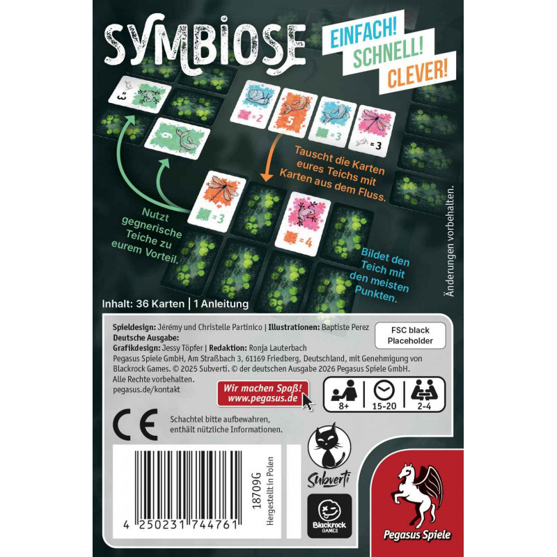 <p><span style="color:#333333;font-family:OfficinaSansITCStd, sans-serif;font-size:18px;font-style:normal;font-weight:400;letter-spacing:normal;text-indent:0px;text-transform:none;word-spacing:0px;white-space:normal;background-color:#ffffff;float:none;">In<span> </span></span><b style="font-weight:bolder;color:#333333;font-family:OfficinaSansITCStd, sans-serif;font-size:18px;font-style:normal;letter-spacing:normal;text-indent:0px;text-transform:none;word-spacing:0px;white-space:normal;background-color:#ffffff;">Symbiose</b><span style="color:#333333;font-family:OfficinaSansITCStd, sans-serif;font-size:18px;font-style:normal;font-weight:400;letter-spacing:normal;text-indent:0px;text-transform:none;word-spacing:0px;white-space:normal;background-color:#ffffff;float:none;"><span> </span>wollen sich die Spielenden innerhalb von sieben Runden den lukrativsten Teich zusammenstellen. In jeder Runde tauschen sie dazu eine Karte aus ihrem Startteich mit einer Karte aus der Auslage, dem Fluss. Ob sie dabei auf volles Risiko gehen und eine noch verdeckte Karte aus ihrem Teich eintauschen oder eine der bereits aufgedeckten Karten, bleibt ihnen überlassen. Durch das Eintauschen gegen offen ausliegende Karten bzw. das Umdrehen einer weiteren Teichkarte liegt in jeder Runde eine offene Karte mehr in der Auslage der Spielenden als in der Runde zuvor. Am Spielende werten die Mitspielenden ihren Teich aus: Für die vier mittleren Karten ihrer Auslage erhalten sie je nach Karte fixe Punkte oder Punkte pro Farbe bzw. Tier in ihrem Teich. Für die variablen Punkte der beiden äußeren 2er-Reihen schauen sie jedoch auf die Teiche der linken bzw. rechten Nachbar*innen.</span><br style="color:#333333;font-family:OfficinaSansITCStd, sans-serif;font-size:18px;font-style:normal;font-weight:400;letter-spacing:normal;text-indent:0px;text-transform:none;word-spacing:0px;white-space:normal;background-color:#ffffff;" /><br style="color:#333333;font-family:OfficinaSansITCStd, sans-serif;font-size:18px;font-style:normal;font-weight:400;letter-spacing:normal;text-indent:0px;text-transform:none;word-spacing:0px;white-space:normal;background-color:#ffffff;" /><b style="font-weight:bolder;color:#333333;font-family:OfficinaSansITCStd, sans-serif;font-size:18px;font-style:normal;letter-spacing:normal;text-indent:0px;text-transform:none;word-spacing:0px;white-space:normal;background-color:#ffffff;">Symbiose</b><span style="color:#333333;font-family:OfficinaSansITCStd, sans-serif;font-size:18px;font-style:normal;font-weight:400;letter-spacing:normal;text-indent:0px;text-transform:none;word-spacing:0px;white-space:normal;background-color:#ffffff;float:none;"><span> </span>kann auch im Duell-Modus 1 gegen 1 gespielt werden oder im Team-Modus 2 gegen 2. Außerdem ist das Teichbauspiel Teil der Spielreihe Einfach! Schnell! Clever!</span></p> <p><span style="color:#333333;font-family:OfficinaSansITCStd, sans-serif;font-size:18px;font-style:normal;font-weight:400;letter-spacing:normal;text-indent:0px;text-transform:none;word-spacing:0px;white-space:normal;background-color:#ffffff;float:none;"></span></p> <table class="pegasus-details-table pegasus-details-table-main" style="caption-side:bottom;border-collapse:collapse;color:#333333;font-family:OfficinaSansITCStd, sans-serif;font-size:18px;font-style:normal;font-weight:400;letter-spacing:normal;text-transform:none;word-spacing:0px;white-space:normal;background-color:#ffffff;"> <tbody style="border:0px solid;"> <tr style="border:0px solid;"> <td style="border:0px solid;">Personenzahl:</td> <td style="border:0px solid;">Für 2 bis 4 Spielende ab 8 Jahren</td> </tr> <tr style="border:0px solid;"> <td style="border:0px solid;">Spieldauer:</td> <td style="border:0px solid;">15 bis 20 Minuten</td> </tr> </tbody> </table> <p><span style="color:#333333;font-family:OfficinaSansITCStd, sans-serif;font-size:18px;font-style:normal;font-weight:400;letter-spacing:normal;text-indent:0px;text-transform:none;word-spacing:0px;white-space:normal;background-color:#ffffff;float:none;"></span></p>