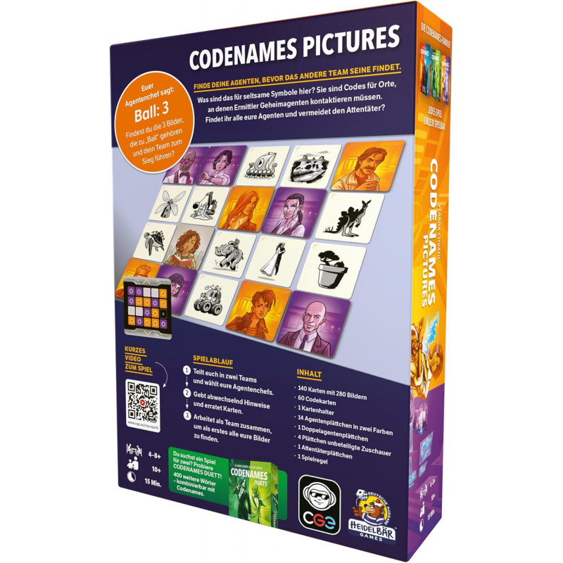 <p><span style="color:#333333;font-family:'Helvetica Neue', Helvetica, Arial, sans-serif;font-style:normal;font-weight:400;letter-spacing:normal;text-indent:0px;text-transform:none;word-spacing:0px;white-space:normal;background-color:#ffffff;font-size:24px;">Der Spielehit Codenames jetzt mit Bildern</span></p> <p style="margin:0px 0px 10px;color:#333333;font-family:'Helvetica Neue', Helvetica, Arial, sans-serif;font-size:14px;font-style:normal;font-weight:400;letter-spacing:normal;text-indent:0px;text-transform:none;word-spacing:0px;white-space:normal;background-color:#ffffff;"></p> <div style="color:#333333;font-family:'Helvetica Neue', Helvetica, Arial, sans-serif;font-size:14px;font-style:normal;font-weight:400;letter-spacing:normal;text-indent:0px;text-transform:none;word-spacing:0px;white-space:normal;background-color:#ffffff;text-align:center;"><i>Jetzt heißt es bildhaft Denken und Beschreiben.</i></div> <p><br style="color:#333333;font-family:'Helvetica Neue', Helvetica, Arial, sans-serif;font-size:14px;font-style:normal;font-weight:400;letter-spacing:normal;text-indent:0px;text-transform:none;word-spacing:0px;white-space:normal;background-color:#ffffff;" /><span style="color:#333333;font-family:'Helvetica Neue', Helvetica, Arial, sans-serif;font-size:14px;font-style:normal;font-weight:400;letter-spacing:normal;text-indent:0px;text-transform:none;word-spacing:0px;white-space:normal;background-color:#ffffff;float:none;">Wie im bekannten Vorgänger </span><i style="color:#333333;font-family:'Helvetica Neue', Helvetica, Arial, sans-serif;font-size:14px;font-weight:400;letter-spacing:normal;text-indent:0px;text-transform:none;word-spacing:0px;white-space:normal;background-color:#ffffff;">Codenames</i><span style="color:#333333;font-family:'Helvetica Neue', Helvetica, Arial, sans-serif;font-size:14px;font-style:normal;font-weight:400;letter-spacing:normal;text-indent:0px;text-transform:none;word-spacing:0px;white-space:normal;background-color:#ffffff;float:none;">, dem Spiel des Jahres 2016, müssen bei </span><span style="color:#333333;font-family:'Helvetica Neue', Helvetica, Arial, sans-serif;font-size:14px;font-style:normal;letter-spacing:normal;text-indent:0px;text-transform:none;word-spacing:0px;white-space:normal;background-color:#ffffff;font-weight:bold;"><i>Codenames Pictures</i></span><span style="color:#333333;font-family:'Helvetica Neue', Helvetica, Arial, sans-serif;font-size:14px;font-style:normal;font-weight:400;letter-spacing:normal;text-indent:0px;text-transform:none;word-spacing:0px;white-space:normal;background-color:#ffffff;float:none;"> die Geheimdienstchefs ihren Teams hilfreiche Hinweise geben, damit ihr Team als Erstes alle Agenten findet. In </span><span style="color:#333333;font-family:'Helvetica Neue', Helvetica, Arial, sans-serif;font-size:14px;font-style:normal;letter-spacing:normal;text-indent:0px;text-transform:none;word-spacing:0px;white-space:normal;background-color:#ffffff;font-weight:bold;"><i>Codenames Pictures</i></span><span style="color:#333333;font-family:'Helvetica Neue', Helvetica, Arial, sans-serif;font-size:14px;font-style:normal;font-weight:400;letter-spacing:normal;text-indent:0px;text-transform:none;word-spacing:0px;white-space:normal;background-color:#ffffff;float:none;"> verbergen sich die geheimen Identitäten der Agenten hinter faszinierend gestalteten, mehrdeutigen Bildern.</span><br style="color:#333333;font-family:'Helvetica Neue', Helvetica, Arial, sans-serif;font-size:14px;font-style:normal;font-weight:400;letter-spacing:normal;text-indent:0px;text-transform:none;word-spacing:0px;white-space:normal;background-color:#ffffff;" /><br style="color:#333333;font-family:'Helvetica Neue', Helvetica, Arial, sans-serif;font-size:14px;font-style:normal;font-weight:400;letter-spacing:normal;text-indent:0px;text-transform:none;word-spacing:0px;white-space:normal;background-color:#ffffff;" /><span style="color:#333333;font-family:'Helvetica Neue', Helvetica, Arial, sans-serif;font-size:14px;font-style:normal;font-weight:400;letter-spacing:normal;text-indent:0px;text-transform:none;word-spacing:0px;white-space:normal;background-color:#ffffff;float:none;">Da in </span><span style="color:#333333;font-family:'Helvetica Neue', Helvetica, Arial, sans-serif;font-size:14px;font-style:normal;letter-spacing:normal;text-indent:0px;text-transform:none;word-spacing:0px;white-space:normal;background-color:#ffffff;font-weight:bold;"><i>Codenames Pictures</i></span><span style="color:#333333;font-family:'Helvetica Neue', Helvetica, Arial, sans-serif;font-size:14px;font-style:normal;font-weight:400;letter-spacing:normal;text-indent:0px;text-transform:none;word-spacing:0px;white-space:normal;background-color:#ffffff;float:none;"> Bilder statt Wörter ausliegen, können durchaus auch jüngere Agenten mitspielen. Für eine Challenge könnt ihr auch die Wortkarten aus dem klassischen Codenames mit dazu nehmen!</span></p> <p><span style="color:#333333;font-family:'Helvetica Neue', Helvetica, Arial, sans-serif;font-size:14px;font-style:normal;font-weight:400;letter-spacing:normal;text-indent:0px;text-transform:none;word-spacing:0px;white-space:normal;background-color:#ffffff;float:none;"></span></p> <div style="color:#333333;font-family:'Helvetica Neue', Helvetica, Arial, sans-serif;font-size:16px;font-style:normal;font-weight:400;letter-spacing:normal;text-indent:0px;text-transform:none;word-spacing:0px;white-space:normal;background-color:#ffffff;"><span style="color:inherit;">Top-Teamspiel!</span></div> <p><span style="color:#333333;font-family:'Helvetica Neue', Helvetica, Arial, sans-serif;font-size:14px;font-style:normal;font-weight:400;letter-spacing:normal;text-indent:0px;text-transform:none;word-spacing:0px;white-space:normal;background-color:#ffffff;float:none;"></span></p> <div style="color:#333333;font-family:'Helvetica Neue', Helvetica, Arial, sans-serif;font-size:16px;font-style:normal;font-weight:400;letter-spacing:normal;text-indent:0px;text-transform:n