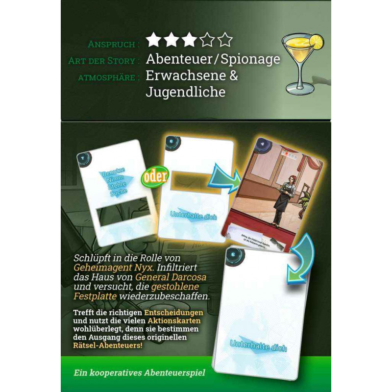 "Ihr entscheidet selbst, welchen Verlauf die Geschichte nimmt. Ihr schlüpft gemeinsam in die Rolle von Agent Nyx und begebt euch auf die Suche nach einer Festplatte mit weltbedrohendem Inhalt. Jede Entscheidung kann weitreichende Folgen haben und den Lauf der Geschichte verändern. Die innovativen Karten mit Fenstern und Aussparungen bieten euch ein ganz neues Spielerlebnis im Bereich der Abenteuer- und Rätselspiele. Schafft ihr es, den Auftrag auszuführen und die Festplatte zu finden?"
