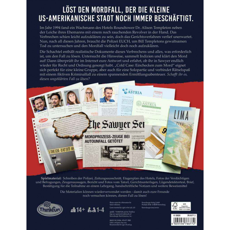 <p><span style="color:#333333;font-family:OfficinaSansITCStd, sans-serif;font-size:18px;font-style:normal;font-weight:400;letter-spacing:normal;text-indent:0px;text-transform:none;word-spacing:0px;white-space:normal;background-color:#ffffff;float:none;">"Ein Wissenschaftler wurde ermordet. Ein Hotel voller Geheimnisse. Cold Case: Einchecken zum Mord – kannst du den Fall lösen?Der fünfte Fall der Cold Case-Reihe entführt Sie zurück ins Jahr 1994. Ein Wissenschaftler wurde in seinem Hotelzimmer ermordet – doch die Polizei konnte den Täter nie fassen. Was ist damals wirklich passiert?In diesem packenden Logikspiel übernehmen Sie die Ermittlungen und tauchen tief in die Hinweise und Spuren von damals ein. Ideal für alle, die Rätsel lieben und ihre detektivischen Fähigkeiten unter Beweis stellen möchten."</span></p> <p><span style="color:#333333;font-family:OfficinaSansITCStd, sans-serif;font-size:18px;font-style:normal;font-weight:400;letter-spacing:normal;text-indent:0px;text-transform:none;word-spacing:0px;white-space:normal;background-color:#ffffff;float:none;"></span></p> <table class="pegasus-details-table pegasus-details-table-main" style="caption-side:bottom;border-collapse:collapse;color:#333333;font-family:OfficinaSansITCStd, sans-serif;font-size:18px;font-style:normal;font-weight:400;letter-spacing:normal;text-transform:none;word-spacing:0px;white-space:normal;background-color:#ffffff;"> <tbody style="border:0px solid;"> <tr style="border:0px solid;"> <td style="border:0px solid;">Personenzahl:</td> <td style="border:0px solid;">Für 1 bis 4 Spielende ab 14 Jahren</td> </tr> <tr style="border:0px solid;"> <td style="border:0px solid;">Spieldauer:</td> <td style="border:0px solid;">30 bis 120 Minuten</td> </tr> </tbody> </table> <p><span style="color:#333333;font-family:OfficinaSansITCStd, sans-serif;font-size:18px;font-style:normal;font-weight:400;letter-spacing:normal;text-indent:0px;text-transform:none;word-spacing:0px;white-space:normal;background-color:#ffffff;float:none;"></span></p>