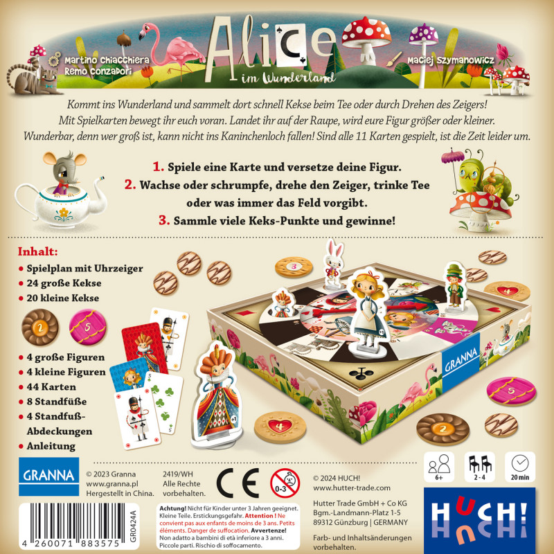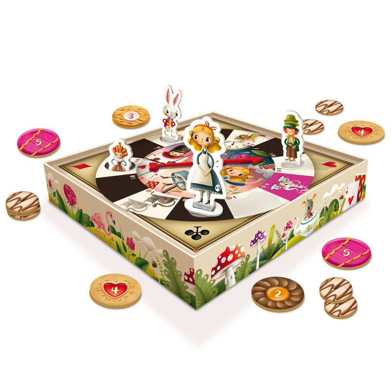 <p><span style="color:#000000;font-family:'Roboto Condensed', sans-serif;font-size:18px;font-style:normal;font-weight:400;letter-spacing:normal;text-indent:0px;text-transform:none;word-spacing:0px;white-space:normal;background-color:#ffffff;float:none;">Lasst euch ins Wunderland von Alice entführen! Sammelt dort als Hutmacher, Kaninchen, Herzkönigin oder Alice so viele Kekse wie ihr könnt. Mit Mini-Spielkarten bewegt ihr euch im Uhrzeigersinn auf dem Spielplan. Aufgepasst: Von den 3 Handkarten dürft ihr nur die linke oder rechte Karte spielen. Rückt dann die entsprechende Zahl an Feldern vor. Kommt ihr auf oder über das Teeparty-Feld, werdet ihr mit großen Keksen belohnt! Auf dem Keks-Feld dürft ihr den Uhr-Glückszeiger drehen und so viele kleine Kekse nehmen wie auf dem Feld angegeben. Landet ihr auf der Raupe, lässt sie eure Figur größer oder kleiner werden. Wunderbar – denn seid ihr groß, könnt ihr nicht ins Kaninchenloch fallen! Wer im Loch sitzt, kann sich nur mit einem guten Zeigerdreh wieder befreien. Sind alle 11 Karten gespielt, ist die Zeit leider um. Wer konnte die meisten Kekspunkte einsammeln? </span><br style="color:#000000;font-family:'Roboto Condensed', sans-serif;font-size:18px;font-style:normal;font-weight:400;letter-spacing:normal;text-indent:0px;text-transform:none;word-spacing:0px;white-space:normal;background-color:#ffffff;" /><br style="color:#000000;font-family:'Roboto Condensed', sans-serif;font-size:18px;font-style:normal;font-weight:400;letter-spacing:normal;text-indent:0px;text-transform:none;word-spacing:0px;white-space:normal;background-color:#ffffff;" /><img class="emoji" alt="✔" src="https://s.w.org/images/core/emoji/17.0.2/svg/2714.svg" style="margin:0px .07em;padding:0px;border-width:medium;border-style:none;font-size:18px;font-weight:400;vertical-align:-.1em;background-image:none;background-color:#ffffff;color:#000000;font-family:'Roboto Condensed', sans-serif;font-style:normal;letter-spacing:normal;text-indent:0px;text-transform:none;word-spacing:0px;white-space:normal;" /><span style="color:#000000;font-family:'Roboto Condensed', sans-serif;font-size:18px;font-style:normal;font-weight:400;letter-spacing:normal;text-indent:0px;text-transform:none;word-spacing:0px;white-space:normal;background-color:#ffffff;float:none;"><span> </span>Fantastisches Spiel, bei dem Figuren größer und kleiner werden </span><br style="color:#000000;font-family:'Roboto Condensed', sans-serif;font-size:18px;font-style:normal;font-weight:400;letter-spacing:normal;text-indent:0px;text-transform:none;word-spacing:0px;white-space:normal;background-color:#ffffff;" /><img class="emoji" alt="✔" src="https://s.w.org/images/core/emoji/17.0.2/svg/2714.svg" style="margin:0px .07em;padding:0px;border-width:medium;border-style:none;font-size:18px;font-weight:400;vertical-align:-.1em;background-image:none;background-color:#ffffff;color:#000000;font-family:'Roboto Condensed', sans-serif;font-style:normal;letter-spacing:normal;text-indent:0px;text-transform:none;word-spacing:0px;white-space:normal;" /><span style="color:#000000;font-family:'Roboto Condensed', sans-serif;font-size:18px;font-style:normal;font-weight:400;letter-spacing:normal;text-indent:0px;text-transform:none;word-spacing:0px;white-space:normal;background-color:#ffffff;float:none;"><span> </span>Zauberhaftes Material: Mini-Spielkarten, ein Uhr-Glückszeiger und viele Kekse! </span></p> <p><span style="color:#000000;font-family:'Roboto Condensed', sans-serif;font-size:18px;font-style:normal;font-weight:400;letter-spacing:normal;text-indent:0px;text-transform:none;word-spacing:0px;white-space:normal;background-color:#ffffff;float:none;"><span style="color:#000000;font-family:'Roboto Condensed', sans-serif;font-size:18px;font-style:normal;font-weight:400;letter-spacing:normal;text-indent:0px;text-transform:none;word-spacing:0px;white-space:normal;background-color:#ffffff;float:none;">2 - 4 Personen</span></span></p> <p><span style="color:#000000;font-family:'Roboto Condensed', sans-serif;font-size:18px;font-style:normal;font-weight:400;letter-spacing:normal;text-indent:0px;text-transform:none;word-spacing:0px;white-space:normal;background-color:#ffffff;float:none;">6 - 99 Jahre</span></p> <p><span style="color:#000000;font-family:'Roboto Condensed', sans-serif;font-size:18px;font-style:normal;font-weight:400;letter-spacing:normal;text-indent:0px;text-transform:none;word-spacing:0px;white-space:normal;background-color:#ffffff;float:none;"><span style="color:#000000;font-family:'Roboto Condensed', sans-serif;font-size:18px;font-style:normal;font-weight:400;letter-spacing:normal;text-indent:0px;text-transform:none;word-spacing:0px;white-space:normal;background-color:#ffffff;float:none;">10 - 20 Minuten</span></span></p>