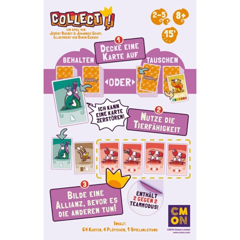 <ul style="color:#18181b;font-family:'Readex Pro', sans-serif;font-size:14px;font-style:normal;font-weight:400;letter-spacing:normal;text-indent:0px;text-transform:none;word-spacing:0px;white-space:normal;background-color:#ffffff;"> <li>Schneller Kartenspaß für 2‑5 Spieler im Wettkampf um die Krone</li> <li>Acht Tiere mit individuellen Fähigkeiten sorgen für überraschende Wendungen</li> <li>In nur etwa 15 Minuten gespielt </li> <li>Leicht erlernbar, süße Grafik</li> <li>Klein verpackt, schnell aufgebaut, ideal für unterwegs</li> </ul> <p><span style="color:#18181b;font-family:'Readex Pro', sans-serif;font-size:14px;font-style:normal;font-weight:bold;letter-spacing:normal;text-align:left;text-indent:0px;text-transform:none;word-spacing:0px;white-space:normal;background-color:#ffffff;float:none;">Spielalter ab (Jahren)</span> 8</p>Collect! ist ein rasantes Kartenspiel für 2‑5 Spieler, bei dem ihr im Dschungel um die Krone kämpft. Jeder Spieler baut reihum seine Auslage auf, zieht eine Karte und versucht, vier gleiche Tiere zu sammeln („Allianz“) – doch jedes Tier verfügt über eine spezielle Fähigkeit, die das Spiel jederzeit auf den Kopf stellen kann. Wer clever spielt, bleibt flexibel – und kann gewinnen!
