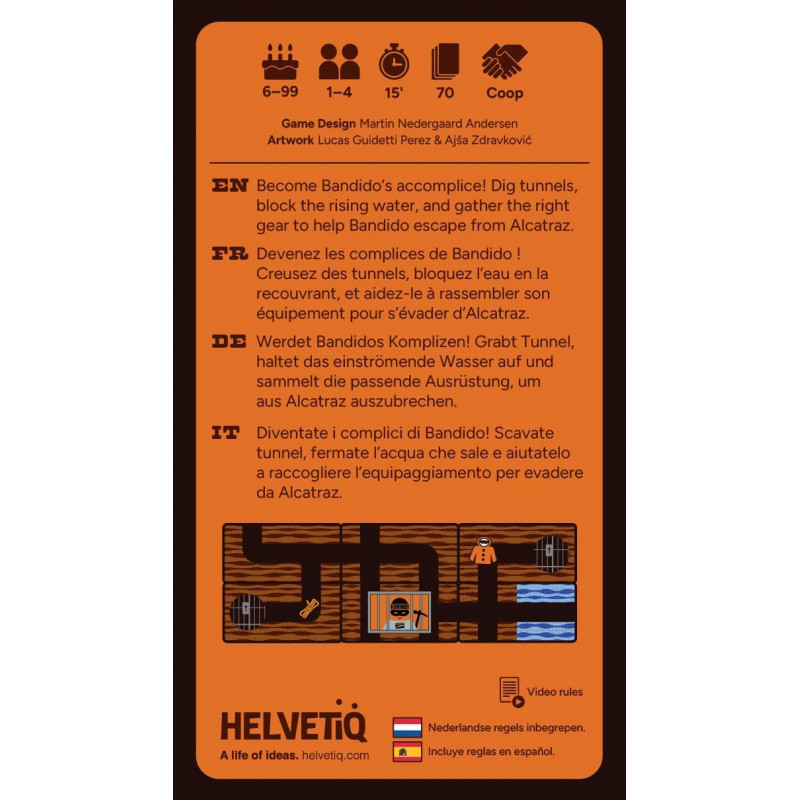<ul class="a-unordered-list a-vertical a-spacing-mini" style="margin:0px 0px 0px 18px;color:#0f1111;padding:0px;font-family:'Amazon Ember', Arial, sans-serif;font-size:14px;font-style:normal;font-weight:400;letter-spacing:normal;text-indent:0px;text-transform:none;word-spacing:0px;white-space:normal;background-color:#ffffff;"> <li class="a-spacing-mini" style="list-style:disc;margin:0px;"><span class="a-list-item" style="color:#0f1111;">JUBILÄUMSEDITION: Bandido wird 10 Jahre alt! Diesmal versucht er den unmöglichen Ausbruch aus dem legendären Gefängnis Alcatraz. Ein eigenständiges Spiel (Stand-Alone), das Basisspiel wird nicht benötigt.</span></li> <li class="a-spacing-mini" style="list-style:disc;margin:0px;"><span class="a-list-item" style="color:#0f1111;">NEUE HERAUSFORDERUNG "FLUT": Das kooperative Spiel wird kniffliger. Neben dem Graben von Tunneln müssen Sie auf das steigende Wasser achten. Wenn die Flut Ihre Wege überflutet, scheitert der Ausbruch!</span></li> <li class="a-spacing-mini" style="list-style:disc;margin:0px;"><span class="a-list-item" style="color:#0f1111;">SOLO ODER TEAM: Funktioniert hervorragend alleine (als strategische Patience) oder im Team mit bis zu 4 Spielern. Diskutieren Sie und legen Sie gemeinsam Karten, um den Wärtern zu entkommen.</span></li> <li class="a-spacing-mini" style="list-style:disc;margin:0px;"><span class="a-list-item" style="color:#0f1111;">EINFACHE REGELN: In 1 Minute erklärt. Karte legen, Weg bauen oder Ausgänge blockieren. Ein süchtig machendes Logikspiel für Kinder und Erwachsene gleichermaßen.</span></li> <li class="a-spacing-mini" style="list-style:disc;margin:0px;"><span class="a-list-item" style="color:#0f1111;">DETAILS: 1 bis 4 Spieler | Spieldauer: 15 Min | Autor: Martin Nedergaard Andersen. Kompaktes Pocket-Format, ideal zum Mitnehmen.</span></li> </ul>