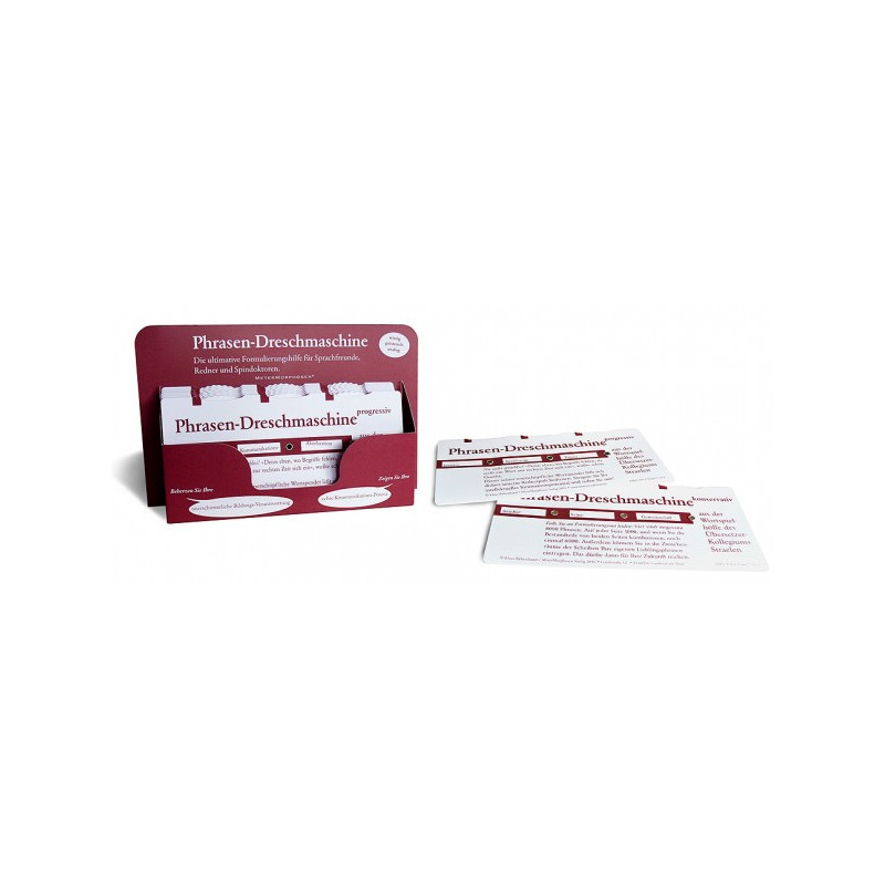 <p>Die analoge Phrasen-Dreschmaschine ist eine überraschende und erheiternde Formulierungshilfe für jede Lebenslage und gleichzeitig ein lebendiger Beweis für das enorme Phrasenpotential der deutschen Sprache. Sie hat drei doppelseitige Drehscheiben für konservative und progressive Aussagen, in den Zwischenräumen lassen sich eigene Worte notieren. Sie passt wie ein Briefumschlag in jede Innentasche und lässt sich auch diskret unterm Rednerpult bedienen. Nicht nur für Demagogen, Chefredner und Spindoktoren.</p>Die analoge Phrasen-Dreschmaschine ist eine überraschende und erheiternde Formulierungshilfe für jede Lebenslage und gleichzeitig ein lebendiger Beweis für das enorme Phrasenpotential der deutschen Sprache. Sie hat drei doppelseitige Drehscheiben für konservative und progressive Aussagen, in den Zwischenräumen lassen sich eigene Worte notieren. Sie passt wie ein Briefumschlag in jede Innentasche und lässt sich auch diskret unterm Rednerpult bedienen. Nicht nur für Demagogen, Chefredner und Spindoktoren.