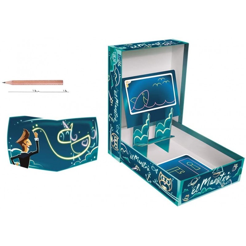 In El Maestro zeichnet ein Spieler ein Werk in der Luft, das nur er sehen kann und die anderen müssen versuchen es nachzumalen und verstehen!Zu Beginn einer Runde wird ein Spieler zum “Maestro” und muss die anderen Spieler ein Werk zeichnen lassen, das nur er sehen kann. Die einzige Möglichkeit euren Spielern euer Werk zu beschreiben: Zeichnet in der Luft, was sich auf eurer Karte befindet, indem ihr die Codes des Maestro benutzt, um die Formen darzustellen!Die anderen Spieler müssen auf ihren Karten nach malen, was aus euren Luftzeichnungen erkennen können. Am Ende der Darstellung schreiben sie die Namen von zwei möglichen Sachen auf, von denen sie glauben, sie hätten sie richtig nachgemalt.Am Ende einer Runde erhalten alle Punkte, wenn sie richtig erraten haben, was der Maestro ihnen zeigen wollte.| Sprache | Deutsch |