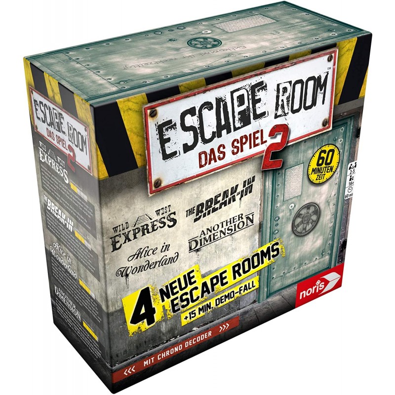 <p><b>Escape Room - Das Spiel 2</b> ist eine neue Grundbox mit vier neuen Abenteuern:<br/><br/><i>Wonderland</i>: Die Spieler landen in einem Raum mit einem riesigen Tisch. Wo ist der Zugang ins Wunderland? Wenn sie nicht in einer Stunde entkommen, bleiben sie für immer hier.<br/><br/><i>The Break-In</i>: Die Spieler sind Diebe und brechen in ein Museum ein. Ziel ist es, ein unbezahlbares Kunstwerk der berühmten Künstlerin Esa Cape zu entwenden. Doch Wachen stehen im Weg.<br/><br/><i>Wild West Express</i>: Während einer Zugfahrt nach Escapetown kommt es zu einem Überfall von Banditen. Diese haben die Lok übernommen und werden sie in einer Stunde in den Abgrund steuern, wenn sie nicht überwältigt werden können. Zusätzlich muss noch der Zug gestoppt werden.<br/><br/><i>Another Dimension</i>: Seit mehreren Monaten passieren komische Dinge in Lockholm. Die Spieler sind in eine Militärbasis eingebrochen, um mysteriösen Ereignissen auf die Spur zu kommen. Doch was sie dort vorfinden, ist ein Portal in eine andere Dimension.<br/><br/>Die Abenteuer sind eine Mischung aus Abenteuern für Anfänger bis Fortgeschrittenen.</p>| Sprache | Deutsch |