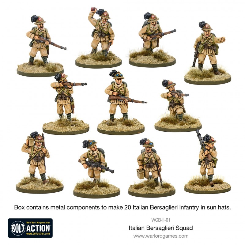 <div style="color:#3c3c3c;font-family:Poppins, Arial, sans-serif;font-size:12px;font-style:normal;font-weight:400;letter-spacing:normal;text-align:left;text-indent:0px;text-transform:none;white-space:normal;word-spacing:0px;background-color:#ffffff;">Italian Bersaglieri contains the following metal miniatures:</div> <div style="color:#3c3c3c;font-family:Poppins, Arial, sans-serif;font-size:12px;font-style:normal;font-weight:400;letter-spacing:normal;text-align:left;text-indent:0px;text-transform:none;white-space:normal;word-spacing:0px;background-color:#ffffff;"> <ul style="margin:0px 0px 25px 20px;padding:0px;list-style:none;"><li style="margin-bottom:6px;"><span style="font-size:14px;line-height:1.5;"></span><span style="font-size:14px;line-height:1.5;">1 officer and 2 attendant riflemen.</span></li> <li style="margin-bottom:6px;"><span style="font-size:14px;line-height:1.5;"></span><span style="font-size:14px;line-height:1.5;">12-man squad: NCO with submachine gun or carbine,</span><span style="font-size:14px;line-height:1.5;">2 Breda light machine gun</span><span style="font-size:14px;line-height:1.5;">teams, and 7 riflemen.</span></li> <li style="margin-bottom:6px;"><span style="font-size:14px;line-height:1.5;"></span><span style="font-size:14px;line-height:1.5;">3-man Breda medium</span><span style="font-size:14px;line-height:1.5;">machine gun team.</span></li> <li style="margin-bottom:6px;"><span style="font-size:14px;line-height:1.5;"></span><span style="font-size:14px;line-height:1.5;">2-man Brixia light mortar team.</span></li> </ul><p style="margin-top:0px;"><span style="font-size:14px;line-height:1.5;">All of the above miniatures are supplied with sun helmets sporting the trademark black feathers of the Bersaglieri. These figures are perfect for fighting battles set in the Western Desert and Tunisia.</span></p> <p style="margin-top:0px;">The Bersaglieri have a long and fine tradition in the Italian army. Formed in 1836, they are an elite unit of infantry and famed for their skill in small arms - Bersaglieri meaning marksman in Italian. They recruited only the fittest and best men into their ranks, and they were renowned, even today, for their marching abilities and swiftness of deployment. This elite Corps show off their prowess by wearing a startling bunch of black capercaillie feathers in their hats and helmets!</p> <p style="margin-top:0px;">During World War II, the Bersaglieri fought in France, Greece, North Africa and even on the Eastern Front as well as in the battle for their homeland, Italy, where they earned the respect of their foes, and the thanks of their allies. As the famed German Field Marshall, Erwin Rommel once said "The German soldier has impressed the world, however the Italian Bersagliere soldier has impressed the German soldier."</p> </div>| Sprache | Englisch |