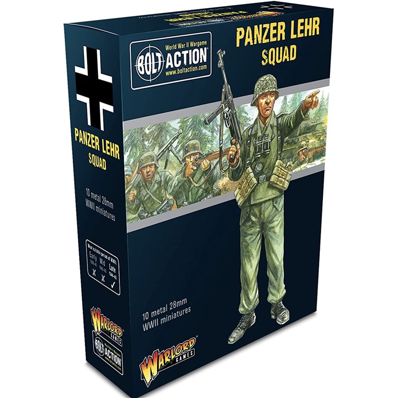 <p style="margin-top:0px;color:#3c3c3c;font-family:Poppins, Arial, sans-serif;font-size:12px;font-style:normal;font-weight:400;letter-spacing:normal;text-align:left;text-indent:0px;text-transform:none;white-space:normal;word-spacing:0px;background-color:#ffffff;">The Panzer Lehr Division (armoured training division) was built in 1943 from the veterans of the North Africa, Sicily and Italy campaigns. These highly experienced troops formed the core of this training and demonstration unit and as such was considered an elite formation from its inception.</p> <p style="margin-top:0px;color:#3c3c3c;font-family:Poppins, Arial, sans-serif;font-size:12px;font-style:normal;font-weight:400;letter-spacing:normal;text-align:left;text-indent:0px;text-transform:none;white-space:normal;word-spacing:0px;background-color:#ffffff;">In 1944, the Panzer Lehr Division took part in the invasion of Hungary before moving to France to await the Allied invasion of Europe. Unlike other panzer divisions of the German wehrmacht, all the panzergrenadiers of the Panzer Lehr were mounted on half-tracks, making it the only fully mechanised unit in the German army. In addition, they were the first to fight alongside the new Tiger II tanks. They also wore a distinctive double-breasted assault gun-style jacket instead of the normal Heer field blouse.</p> <p style="margin-top:0px;color:#3c3c3c;font-family:Poppins, Arial, sans-serif;font-size:12px;font-style:normal;font-weight:400;letter-spacing:normal;text-align:left;text-indent:0px;text-transform:none;white-space:normal;word-spacing:0px;background-color:#ffffff;">Contains 10 metal Panzer Lehr squad models and plastic base</p>| Sprache | Englisch |
